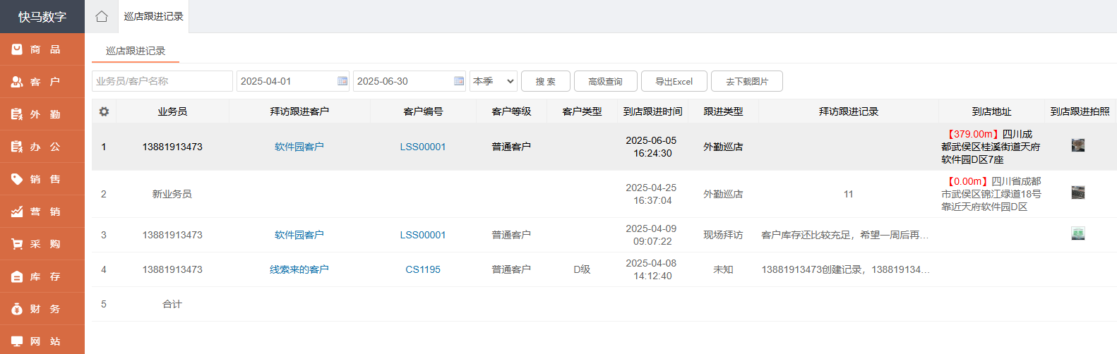 快馬數字業務員外勤巡店記錄匯總局部界面截圖